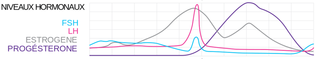 Donc, en 1ère partie de cycle, on a un peu de LH et de FSH, produites au niveau du cerveau, et surtout de plus en plus d’oestrogènes, produites par les follicules au niveau des ovaires.