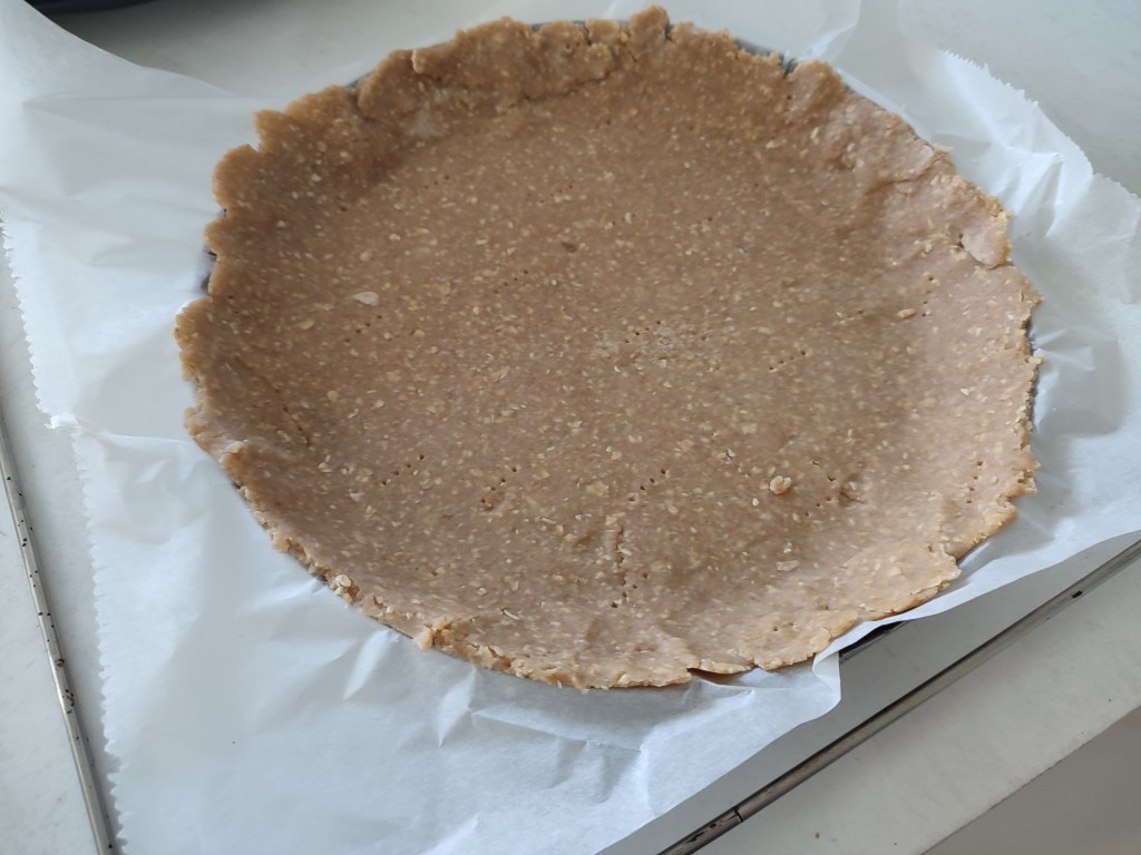 Pendant ce temps, préparez la pâte à tarte en mélangeant dans, un saladier la farine, les flocons d’avoine, le germe de blé et le sel. Ajouter le beurre en pétrissant entre les doigts. Puis ajouter l’eau à ce mélange afin de former une boule qui se tient. pétrissez jusqu’à ce que la pâte ne colle plus.