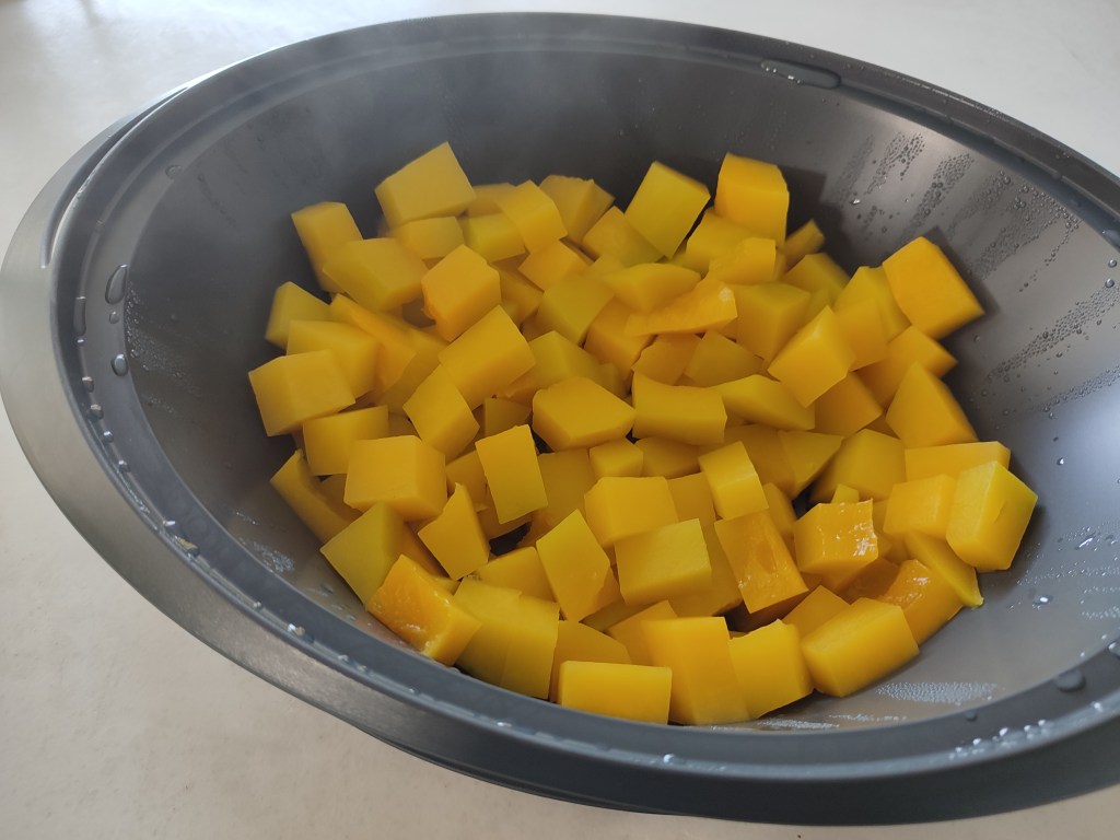 Coupez la courge butternut en deux et enlever les pépins. Epluchez-la et couper là en morceaux. Faites la cuire à la vapeur pendant 15 minutes. Réservez dans un saladier puis laisser refroidir.