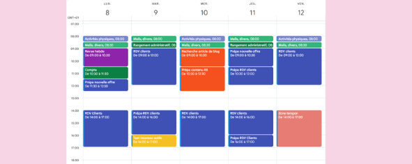 - Puis répartis des blocs de temps pour chaque casquette dans les espaces restants, selon ce que tu veux (et non ce que “tu devrais”).
